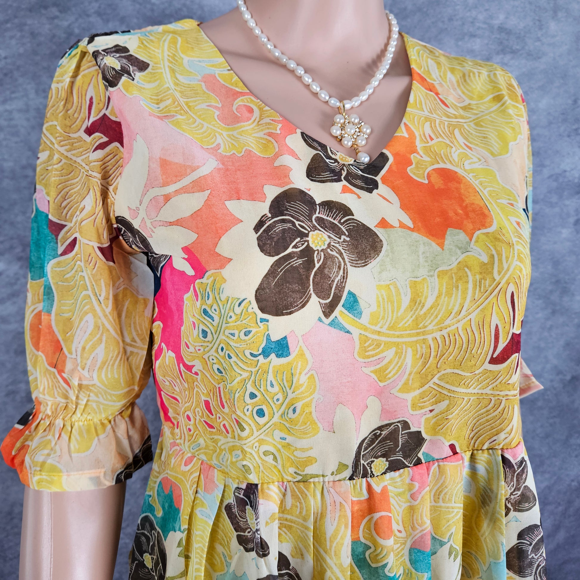 Make a bold statement in the Bolt Yellow Black Floral Georgette Frock. Its vibrant yellow base contrasted with striking black floral motifs creates a daring and unforgettable look. Crafted from lightweight georgette, this frock offers fluid movement and a flattering fit, perfect for turning heads at any occasion. Embrace vivid style and confident elegance with this standout piece.
