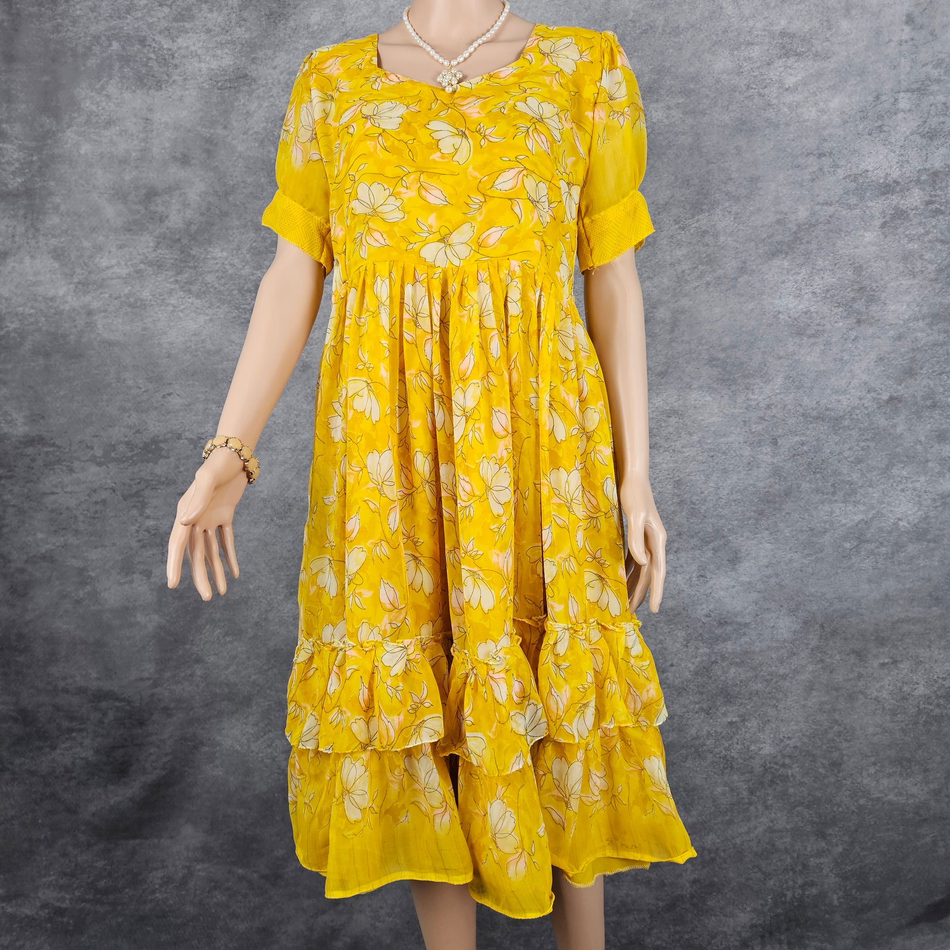 Embrace transformation and joy with this butterfly yellow georgette frock, a delightful piece that celebrates growth and natural beauty. The cheerful yellow hue combined with graceful butterfly motifs creates an uplifting, whimsical aesthetic that feels both playful and refined. The lightweight georgette fabric provides breathable comfort that keeps you feeling supported and at ease throughout your day. The flowing silhouette flatters your figure while allowing complete freedom of movement and graceful expression. Perfect for garden parties, casual outings, or whenever you want to feel genuinely inspired and alive. This versatile frock pairs beautifully with minimal accessories, letting its charming design take center stage. Invest in a piece that encourages you to embrace positive change, celebrate your unique journey, and feel authentically confident, comfortable, and truly yourself with every wear.