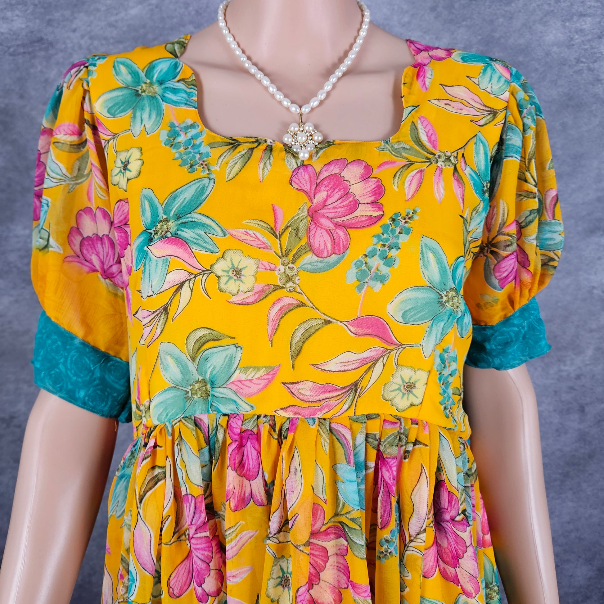 Radiate positivity with this yellow splashed georgette frock, a vibrant piece that brings artistic flair and sunny energy to your wardrobe. The dynamic yellow splashes create an expressive, contemporary design that celebrates creativity and individuality. Crafted from breathable georgette fabric, this frock keeps you feeling comfortable and supported as you move through your day with confidence and ease. The graceful silhouette flatters your figure while allowing complete freedom of movement and natural flow. Perfect for creative gatherings, weekend adventures, or whenever you want to express your vibrant personality and zest for life. This versatile frock pairs beautifully with simple accessories, letting its bold design take center stage. Invest in a piece that encourages you to embrace color, celebrate your authentic self, and feel genuinely joyful, comfortable, and confidently yourself with every wear.